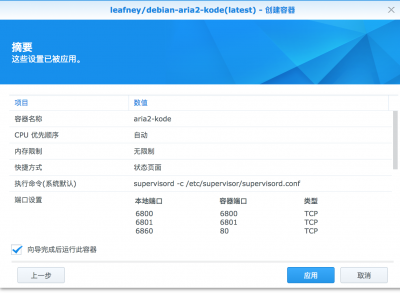 回到 “创建容器” 界面,点击 “下一步” 。查看我们设置的容器信息,勾选左下角的 “向导完成后运行此容器” 项,然后点击 “应用” 等待容器启动。